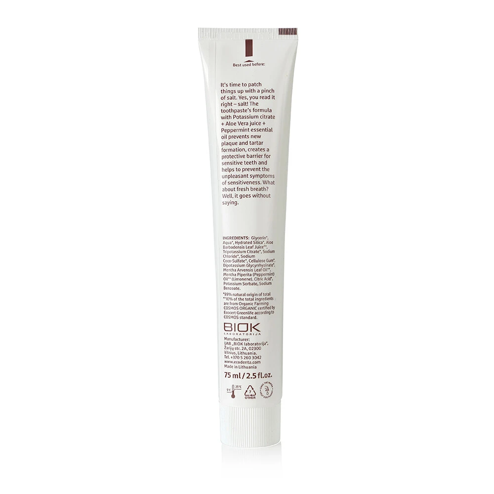 Ecodenta Tandpasta SensitiveEcodenta Sensitive tandpasta is speciaal voor het dagelijkse mondverzorging bij gevoelige tanden en tandvlees. Het mineraal Kalium creëert een beschermende barrière die gevoelige tanden beschermt tegen invloeden van buitenaf. Met als gevolg; geen last meer van warme en koude dranken of zuren uit voeding. Het aloë vera extract heeft een kalmerend effect bij gevoelig en geïrriteerd tandvlees. De toegevoegde natuurlijke zouten hebben een licht antib