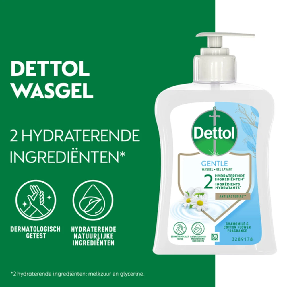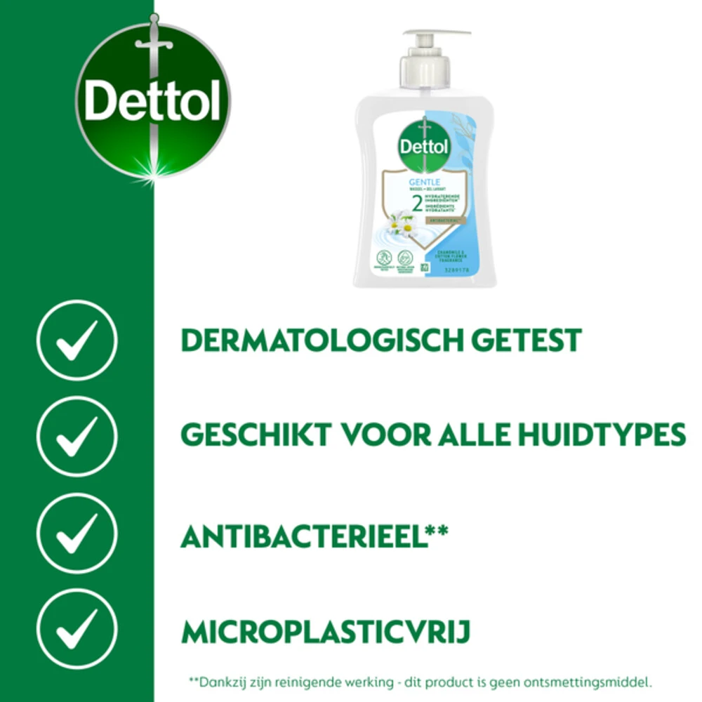 Dettol Handzeep Extra Care KamilleDettol Extra Care+ biedt een extra verzorging, voor een extra zacht gevoel. Dettol Extra Care+ met de heerlijke geur van Lotusbloem en Kamille olie beschermd de natuurlijke vochtbalans van de huid gedurende 3 uur en helpt tegen de verspreiding van bacteriën.Dettol Extra Care+ Handzeep – Extra zacht voor de huid, hard tegen vuil en bacteriën. Voor normale en gevoelige huid.Voor de gevoelige huidBeschermend en reinigendHard tegen vuil en bacteri&eu