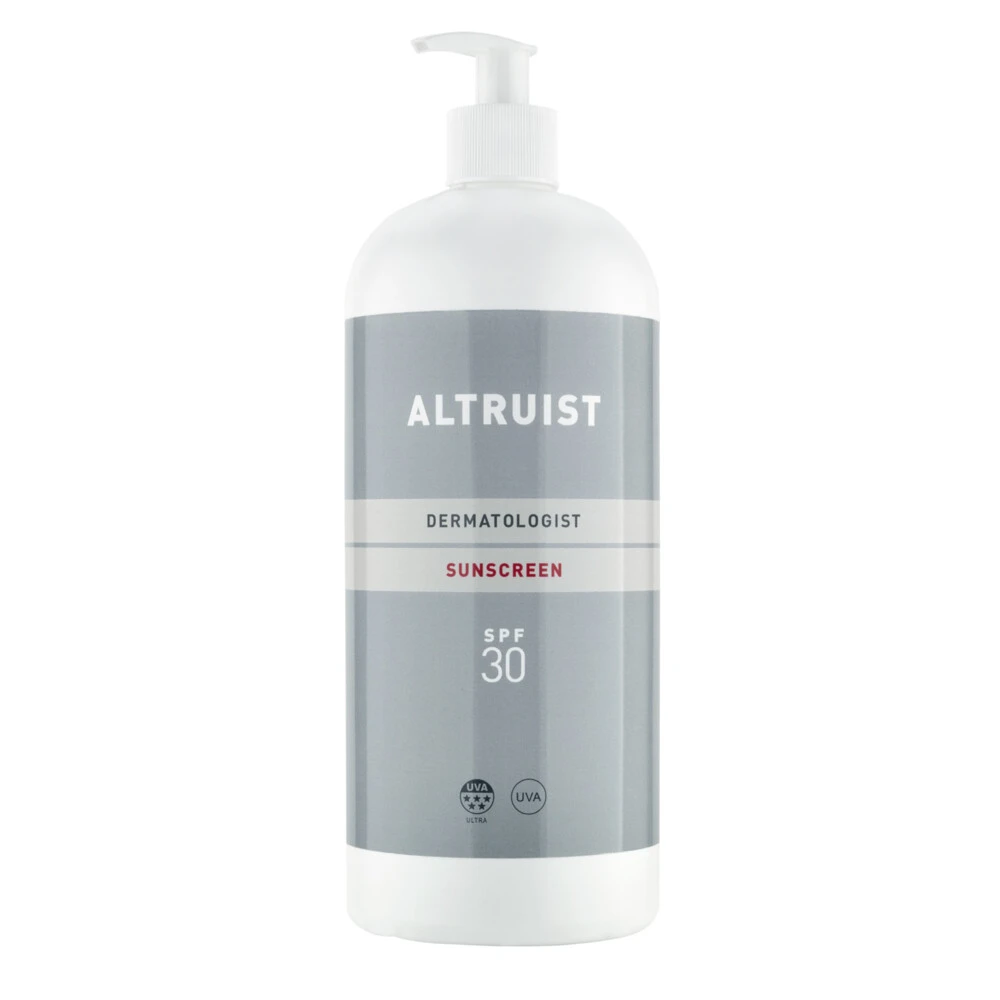 Altruist Zonnebrand Creme SPF 30 – 1000mlOntwikkeld door Dr. Andrew Birnie een Engelse Huidkanker SpecialistAanbevolen door dermatologen5* Ultra UVA-bescherming, brede range van fotostabiele filtersUVA- en UVB-breedband beschermingOntwikkeld voor de gevoelige huid: hyperallergeen en zonder parfum en parabenenWordt snel opgenomen in de huid en is niet vetVoor dagelijks gebruik voor gezicht en bodySpeciaal voor kinderen en waterproofKlinisch getestGeschikt voor mensen met een zonneallergie