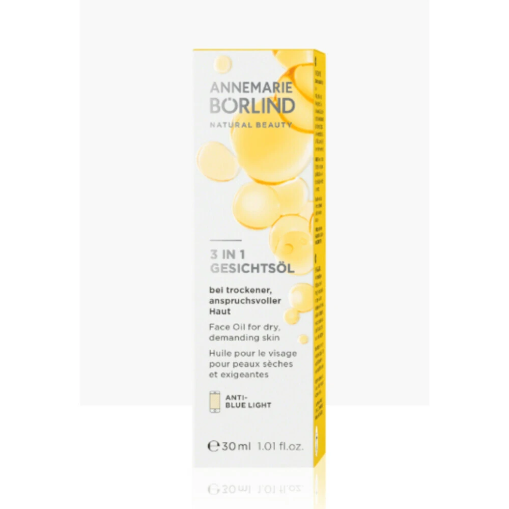 Annemarie Börlind Gezichtsolie 3in1 30 mlVerzorgende oliën zoals Inca Omega-olie, Kahaiolie en Himalaya-kersenolie versterken de huidbarrière en zorgen voor soepelheid. Tagetes (afrikaantje) beschermt tegen Blue Light- straling en werkt antioxidatief.Voor een ontspannen, geregenereerde huid.Anti-blue light.Versterkt de huidbarrière en zorgt voor soepelheid.