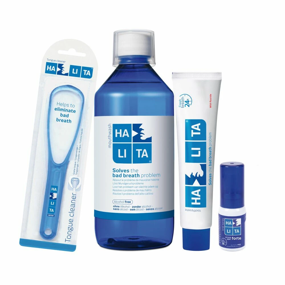 Halita Slechte Adem Voordeelpakket Dit complete mondverzorgingspakket pakt slechte adem grondig aan. Het bevat namelijk alle artikelen om snel van een slechte adem af te komen. In het pakket zit Halita mondspoelmiddel, tandpasta, tongreiniger en mondspray. Doordat je alles in koopt in dit voordeelpakket krijg je uiteindelijk een interessante korting. Halita zorgt voor een frisse adem en een gezonde tong!