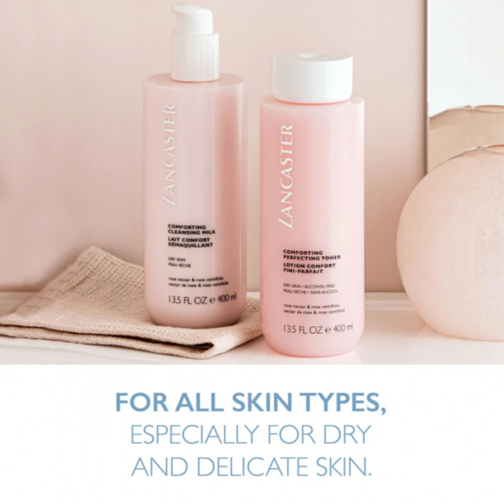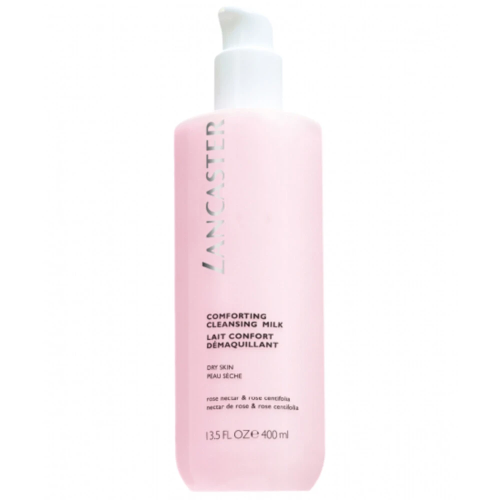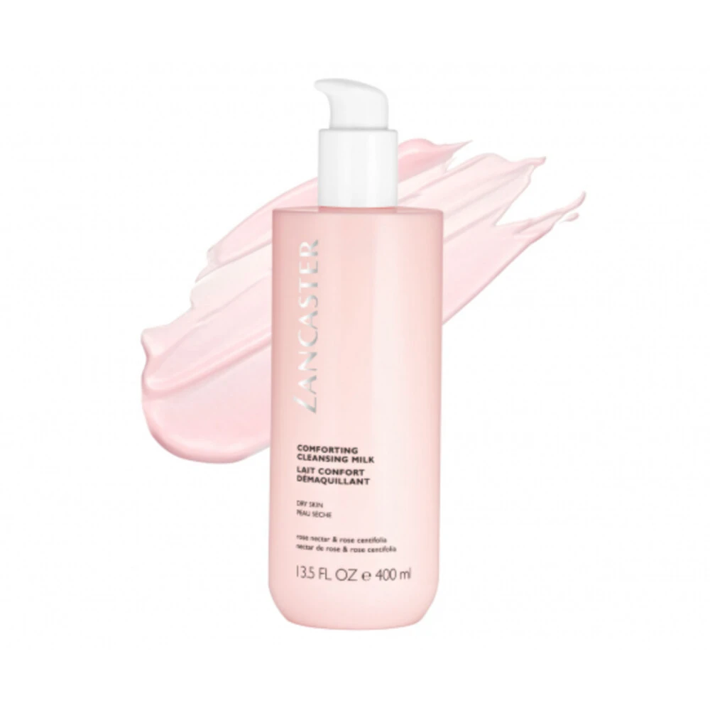 Lancaster Comforting Cleansing MilkLancaster Comforting Reiniging 400 ml is een zachte, hydraterende reinigingsmelk die geschikt is voor alle huidtypes, met name de gevoelige huid. De formule is verrijkt met amandelolie en sheaboter, die de huid hydrateren en voeden, terwijl het vuil, de make-up en onzuiverheden worden verwijderd. De huid voelt na gebruik schoon, zacht en comfortabel aan.Drie belangrijke kenmerken van Lancaster Comforting Reiniging 400 ml zijn:Zachte reiniging: De formule reinig